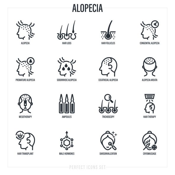 Patchy alopecia areata is one, numerous, or conjoined (reticular) patches of hair loss. Alopecia totalis is the total or near-whole loss of scalp hair, whereas alopecia universalis is the whole or almost total loss of hair on all hairy body surfaces.